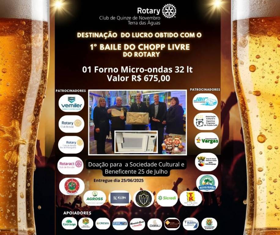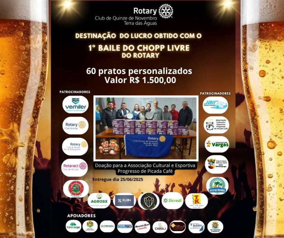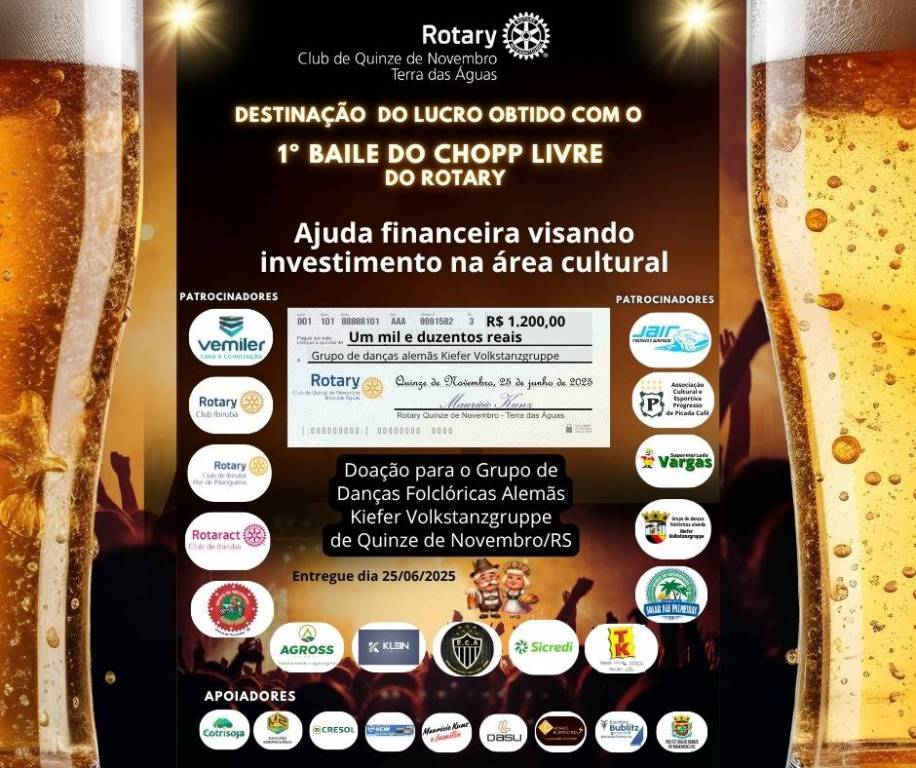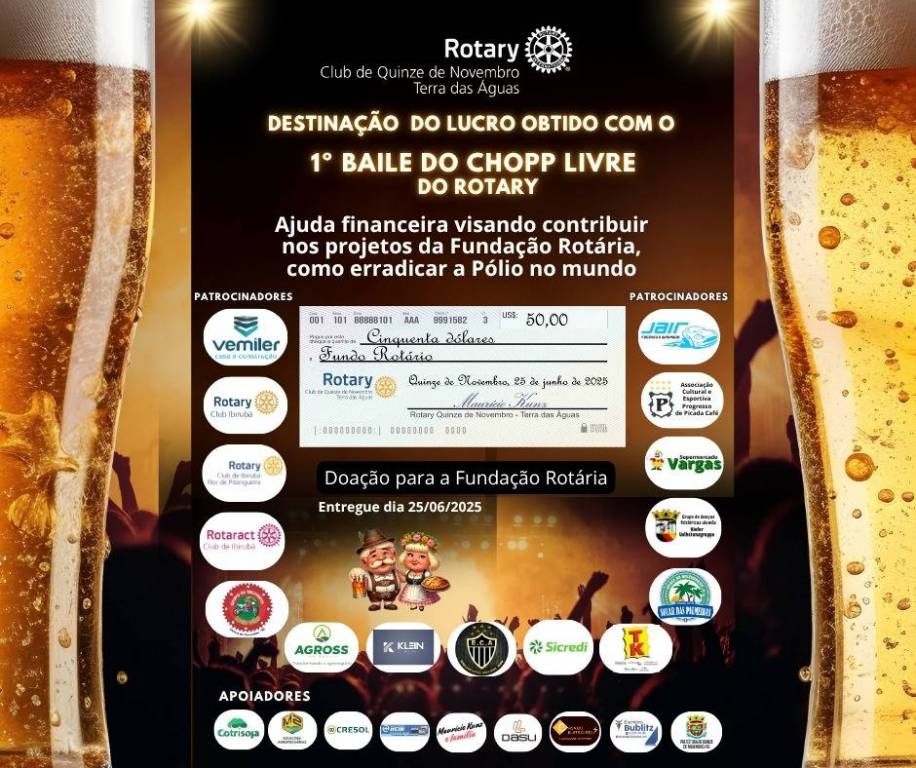 O Rotary Club de Quinze de Novembro Terra das Águas vem prestar contas a patrocinadores, colaboradores e comunidade em geral da aplicação do lucro obtido com o 1º Baile de Chopp Livre do Rotary, realizado em janeiro desse ano, enfatizando uma gestão transparente e voltada a ajuda a nossa comunidade. Agradecemos muito a todos que acreditaram e contribuíram com o evento, cada patrocinador e colaborador tem sua parcela de participação nessas doações realizadas. A todos que se divertiram no nosso baile nosso muito obrigado pela presença e esperamos vê-los novamente na próxima edição.