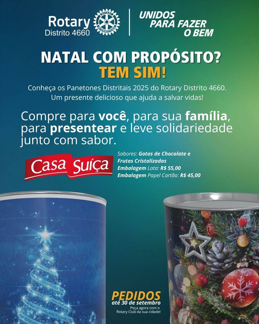 Iniciada mais uma campanha dos Panetones do Rotary, edição 2025, um presente delicioso para familiares e amigos neste Natal! Procure os rotarianos e encomende o seu, ajudando assim a combater a poliomielite no mundo com sabor, união e propósito!